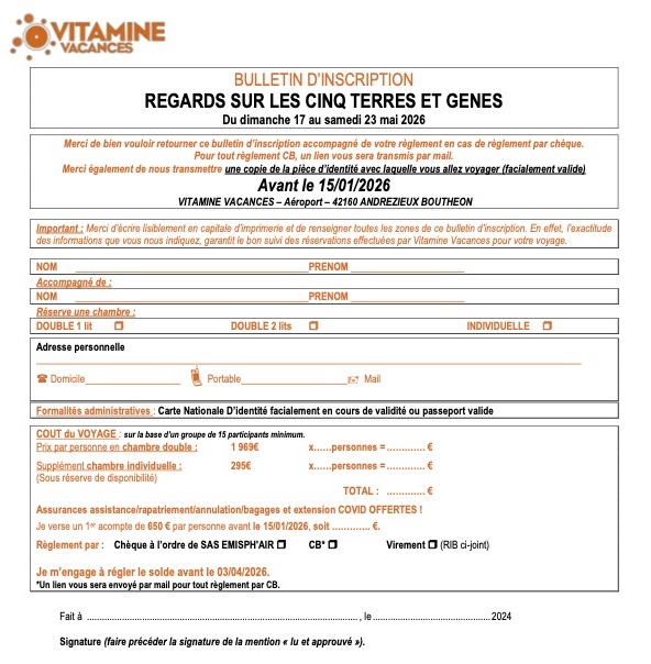 Inscription au plus tard le 15 février directement à Vitamines vacances dont les coordonnées sont précisées dans le formulaire d’inscription.