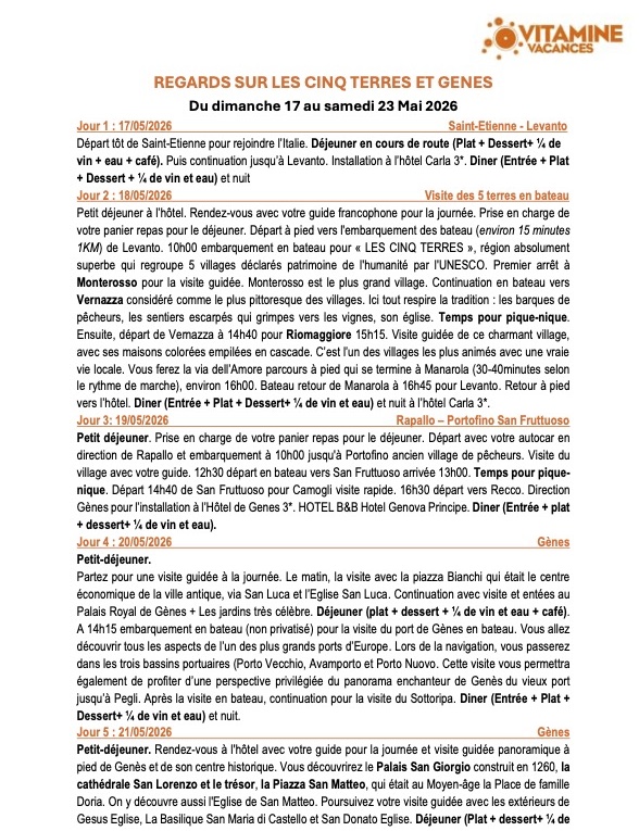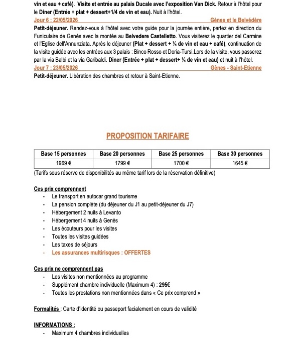 L’AMVARA Loire organise un voyage à Gênes et les 5 terres du 17 mai au 23 mai. Elle dispose encore de 4 places disponibles (sur 25 au total).