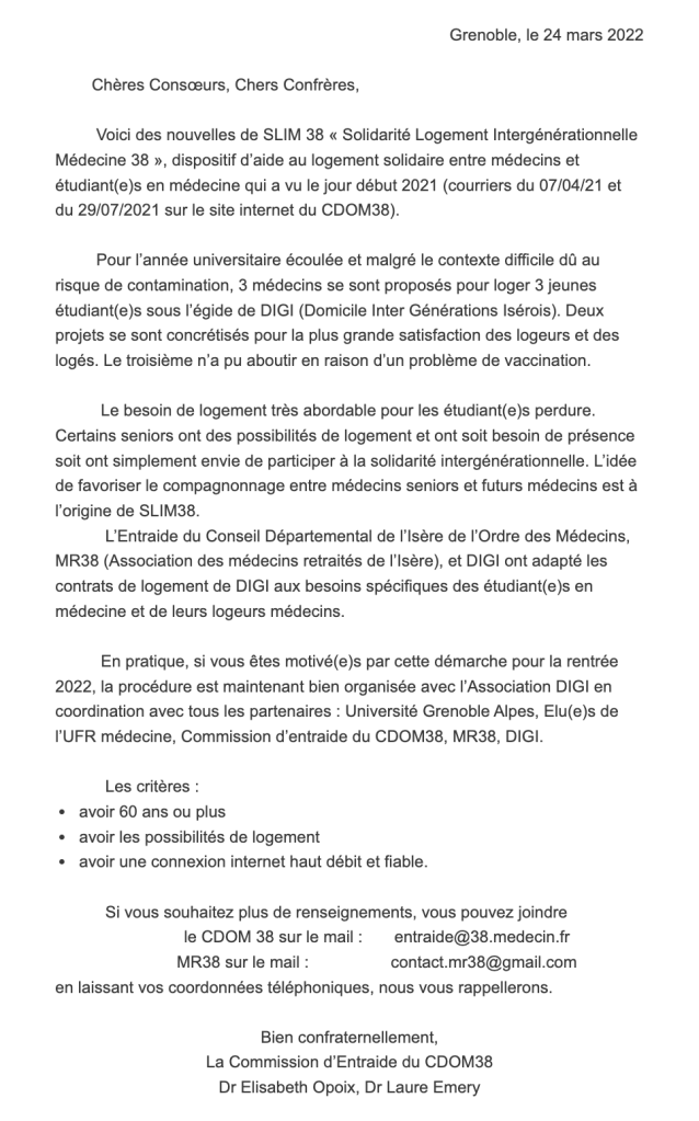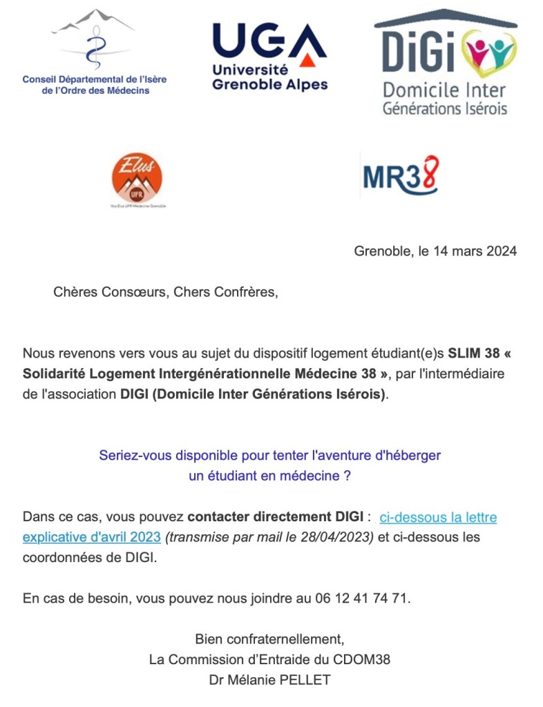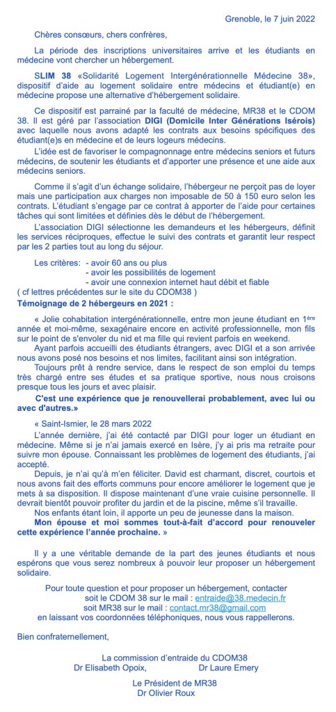 L’entraide du Conseil départemental de l’Isère de l’Ordre des médecins et l’association MR38 reviennent vers vous dans le cadre du dispositif SLIM 38 car la période des inscriptions universitaires arrive et les étudiants en médecine vont chercher un hébergement.