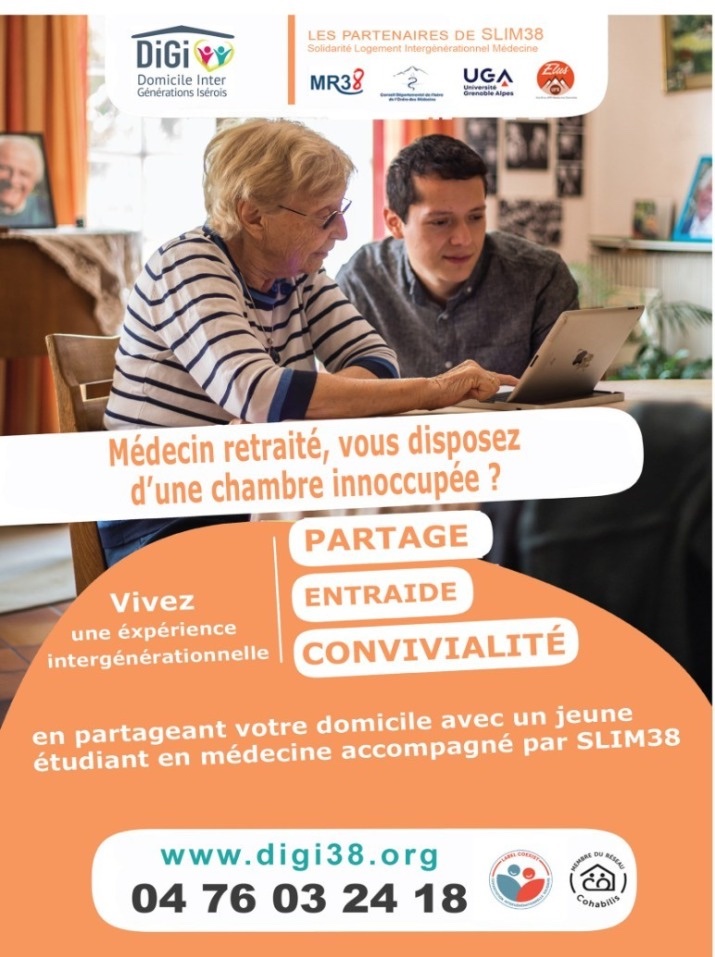 SLIM 38 « Solidarité Logement Intergénérationnelle Médecine 38 », dispositif d’aide au logement solidaire entre médecins et étudiant(e) en médecine propose une alternative d’hébergement solidaire pour les étudiants en médecine chez des médecins seniors volontaires pour les accueillir pour l’année universitaire.