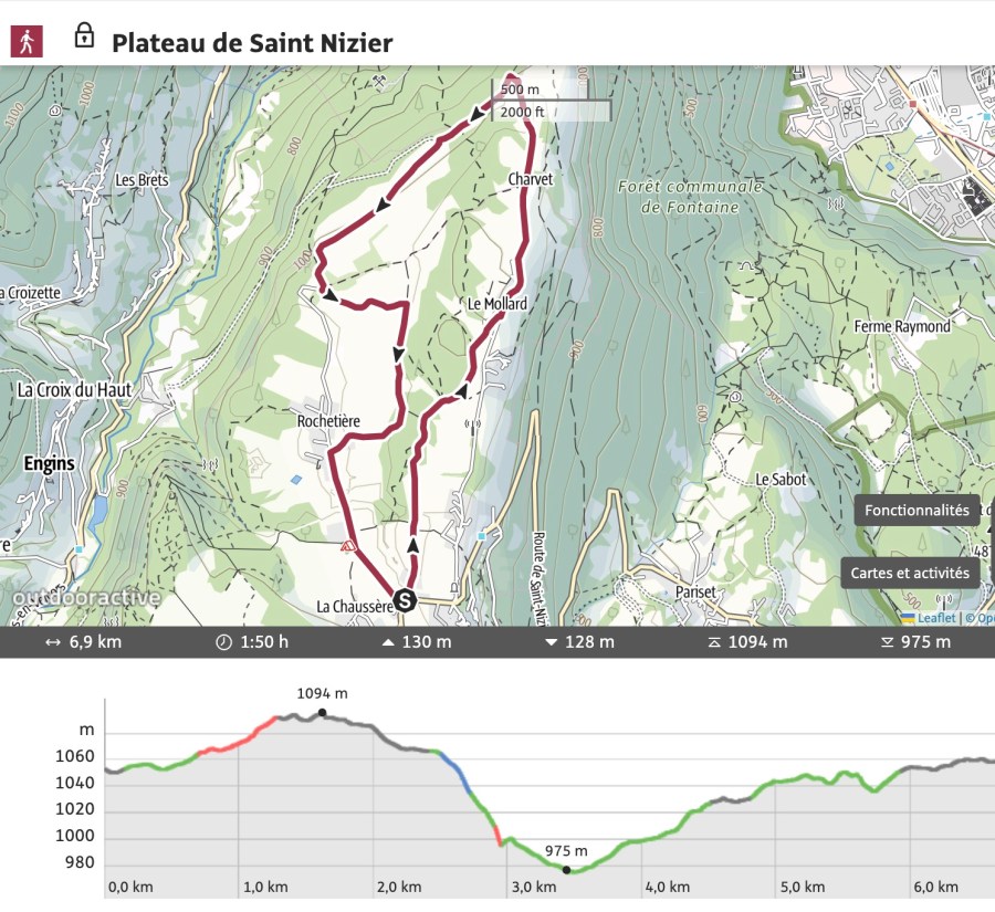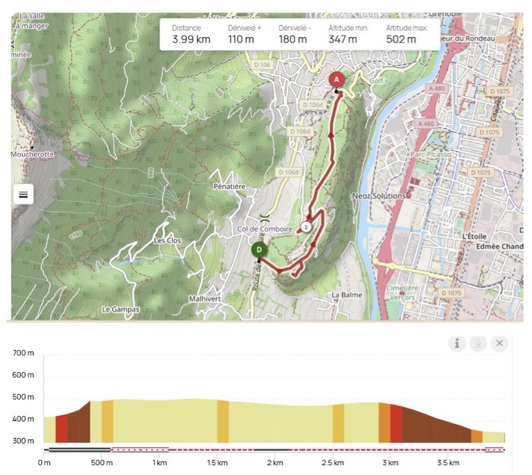 Le parcours d’environ 4 km débute au col de Cossey (dit aussi col de Comboire) et se termine à Pré Nouvel à Seyssins. Il débute par une montée facile en direction du fort avec des crochets facultatifs aux différents belvédères et se poursuit par une descente en pente douce vers Pré Nouvel.