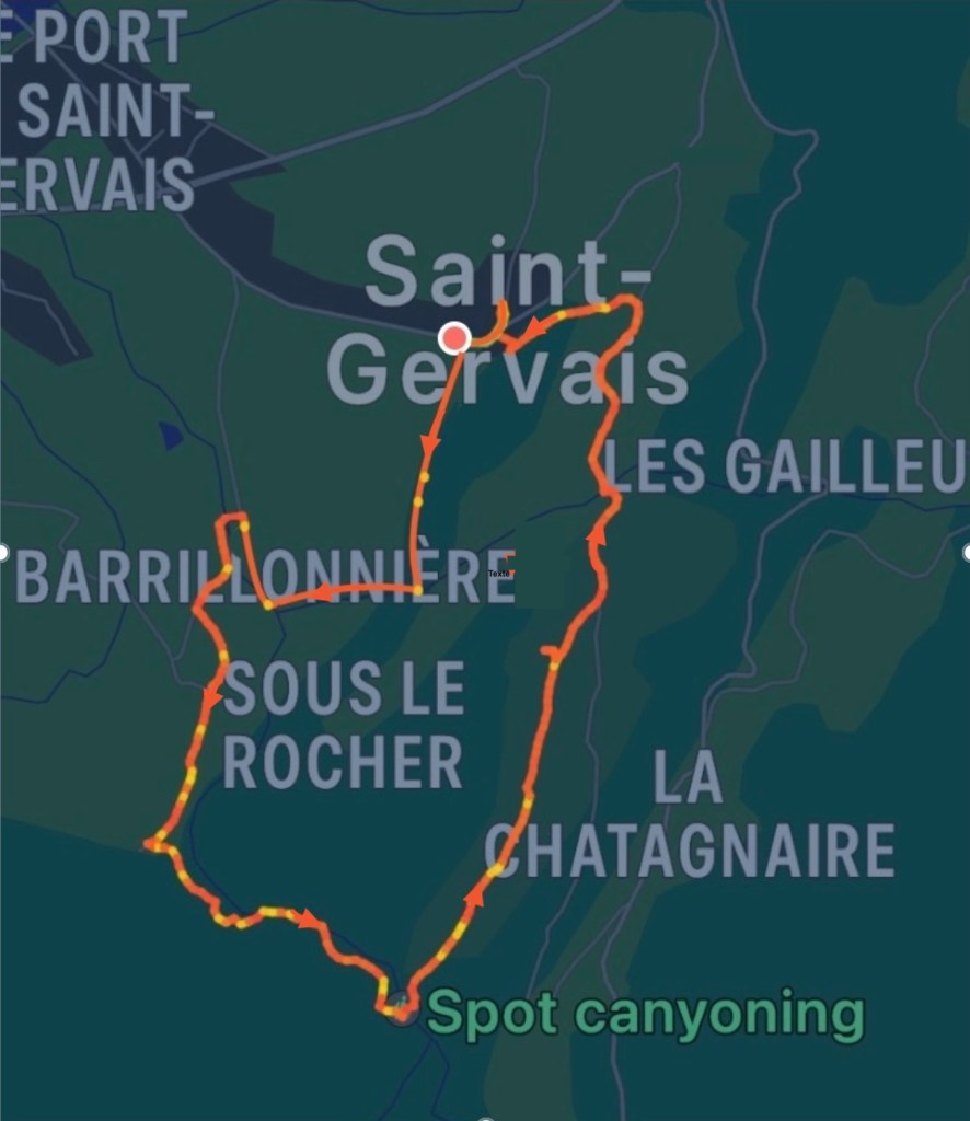 Finalement nous avons fait le circuit dans le sens inverse que celui décrit dans le topo : remontée en pente douce des gorges du Gorgonnet et descente plus raide sur le village de St Gervais par les chemins goudronnés.