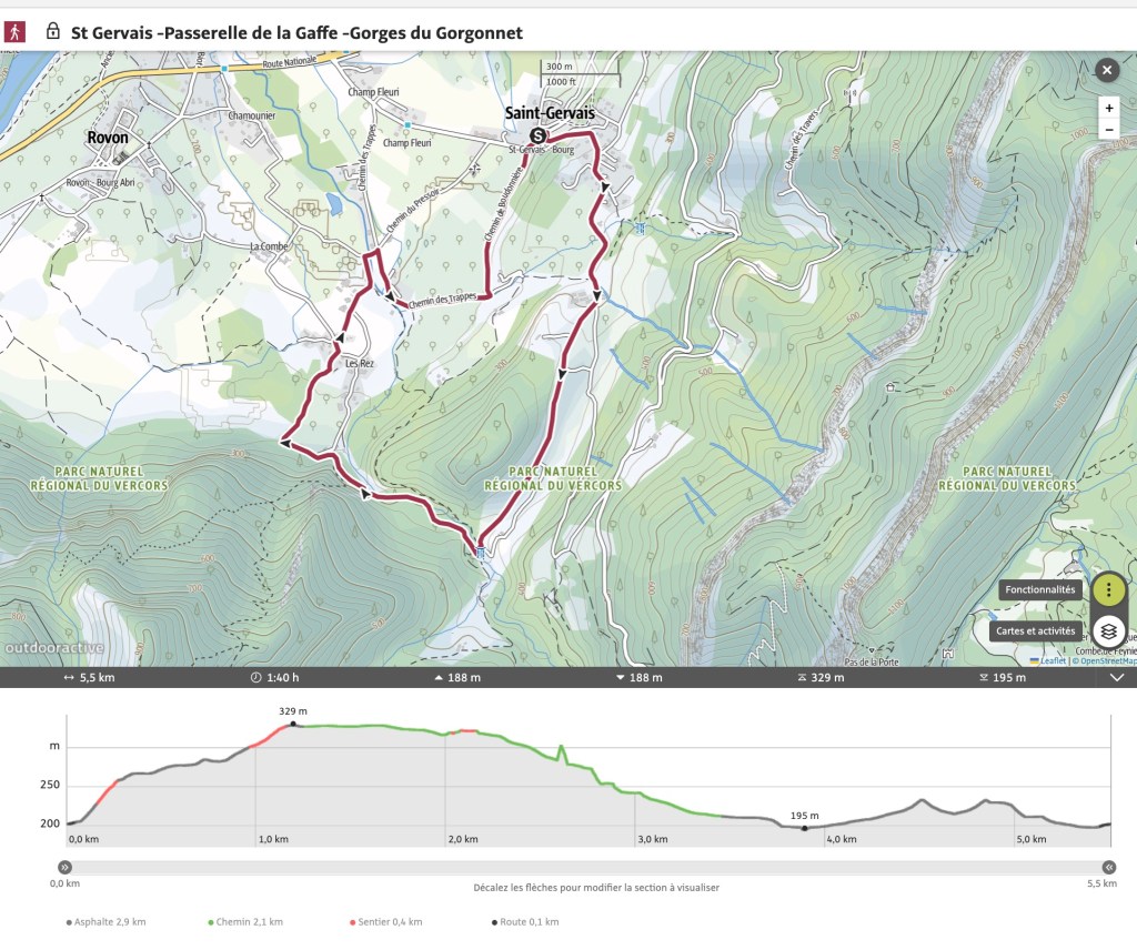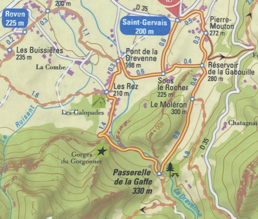 MR38 vous propose une ballade facile dans un cadre magnifique. Seule petite ombre au tableau, elle démarre par une montée assez soutenue dès le départ par la rue de l’Ancienne Poste et le Chemin sur le Village jusqu’au Chemin de Pierre-Mouton puis le Réservoir de la Gabouille et le Moléron. Elle se poursuit en pente douce jusqu’à la passerelle de la Gaffe sur la Drevenne puis par la descente des Gorges de Gorgonnet pour déboucher aux Rez. Le retour sur Saint Gervais se fait par le pont sur la Drevenne et le chemin de Boudonnière en passant par différents hameaux du village.