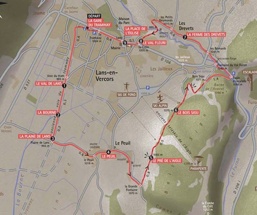Le parcours d’environ 6 km démarre à la gare du tram et suit l’ancienne voie en direction de Villard-de-Lans. Au bout de 1,2 km on la quitte en direction du hameau du Peuil. Débute alors une montée assez soutenue vers le Pré de l’Aigle et le Bois Sigu, point culminant avec vue sur le Val de Lans. Il se poursuit par la descente vers le parking de l’Ecole d’escalade et retour par la Ferme des Drevets et le Petit Geymond avant de rejoindre l’Eglise de Lans et le point de départ.