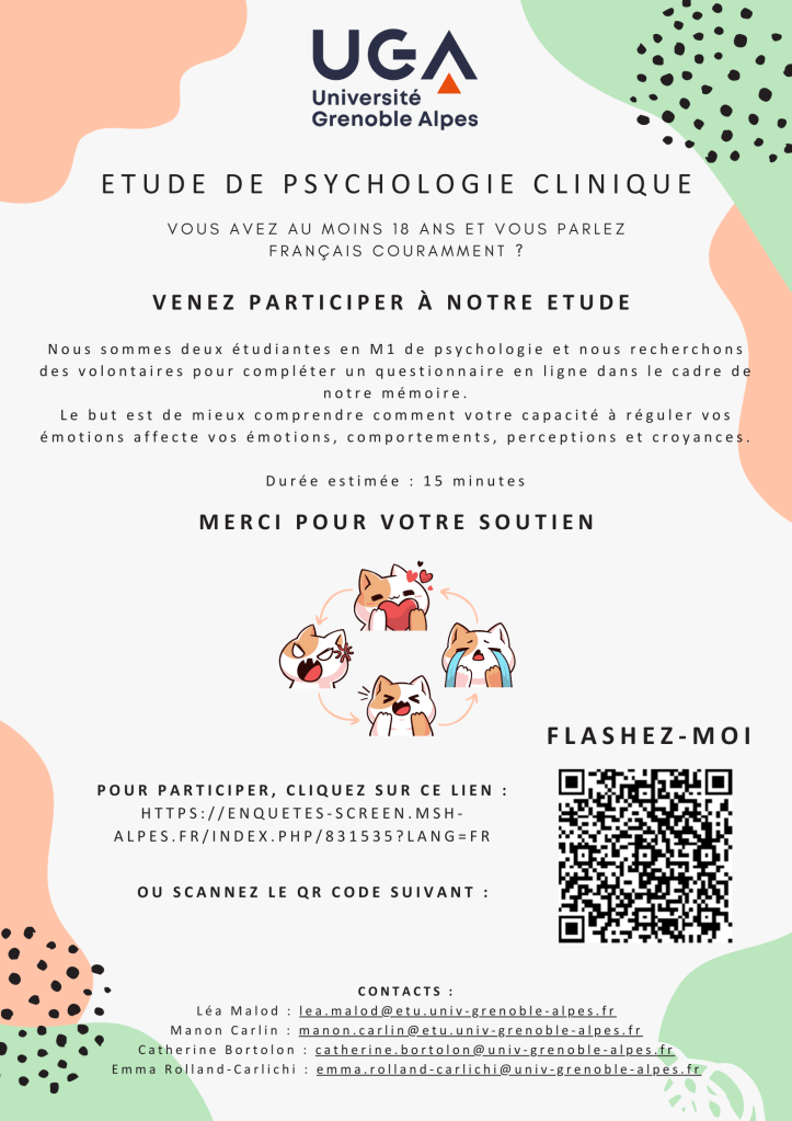 Deux étudiantes en Master 1 de psychologie clinique à l’Université Grenoble Alpes (UGA) mènent une étude portant sur la régulation émotionnelle dans le cadre de leur mémoire. Cette recherche vise à mieux comprendre comment la capacité à réguler les émotions affecte les émotions, comportements, perceptions et croyances. Elles sont à la recherche de volontaires pour cette étude et voudraient savoir s’il est possible d’y faire participer des membres de MR38.