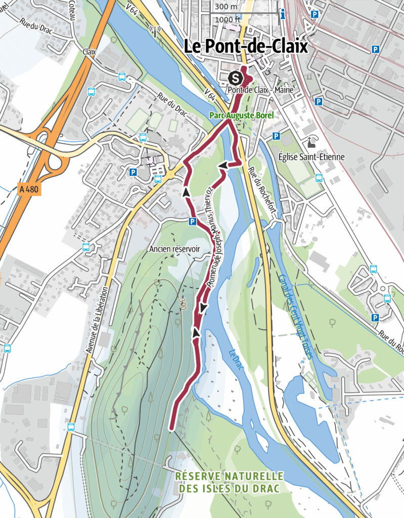 Au départ du Pont de Claix, parking Rue Parmentier. Montée Georges Tord, Passerelle du Drac, Promenade Joseph-Marius Thievoz qui aboutit à la Réserve Naturelle des Isles du Drac où sont puisées les eaux potables de l’agglomération grenobloise. Retour par la Rue des Sources, le Pont Lesdiguières et le Parc Auguste Borel.